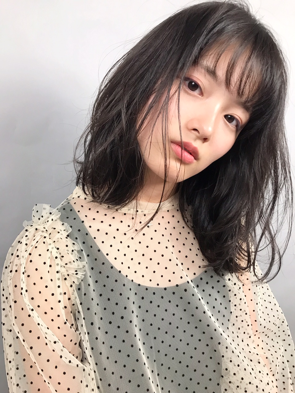 黒髪が清楚でピュアな印象に。シースルーバングと柔らかなニュアンスパーマで、